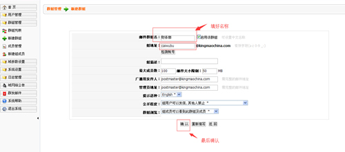 第七步,填写好“群组名”和“组地址”,例如:群组名“财务部”,组地址“caiwubu”,最后确认
