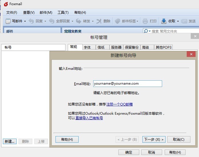 打开foxmail,菜单栏的工具(T)-- 帐号管理(C)--新建