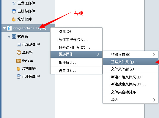 4.新建好的帐号默认隐藏了发件箱,已发邮件默认会归档到草稿箱里面. 在刚建好的IMAP邮箱上右键—更多操作-整理文件夹,选中Outbox 点显示,使其结果如下图